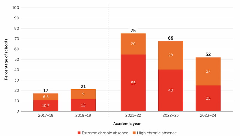 The percent of schools in California with a high chronic absence rate (20-29% of students) and extreme rate (30% or more of students). Source: PACE: Unpacking California's Chronic Absence Crisis