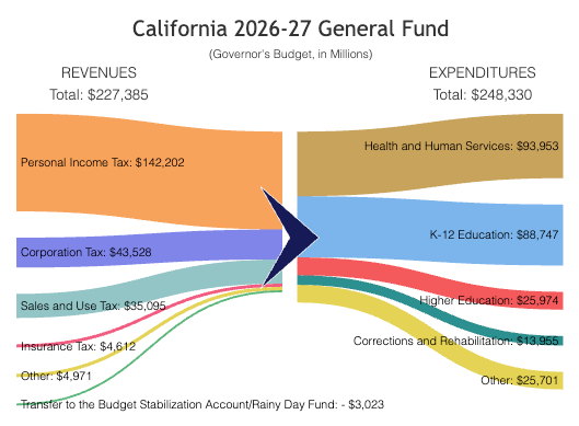 Each January, California’s governor proposes a state budget based on a forecast of how much the state and school districts will take in through taxes. Using the proposed budget for 2026-27, this post walks you through how money flows, with a focus on education.