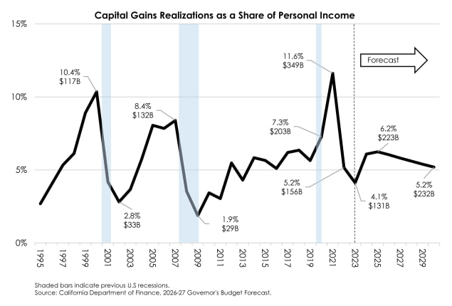 From the state budget summary: “The Budget projects capital gains realizations to increase 8 percent in 2025 and 1 percent in 2026, compared to a 15-percent decline in 2025 and flat growth in 2026 assumed in the 2025 Budget Act.”