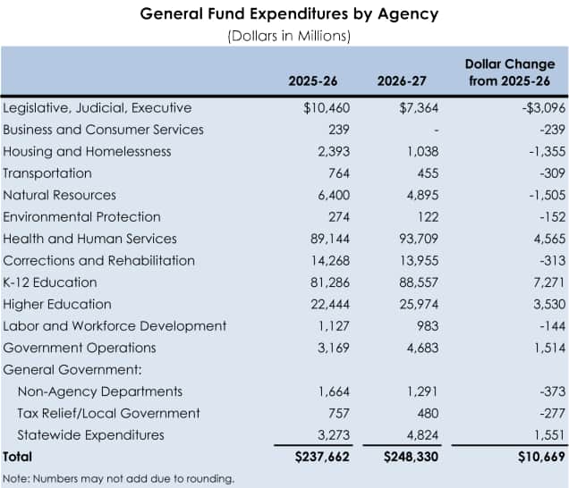 The table below looks at how money is spent in the proposed 2026-27 state budget, compared to last year.