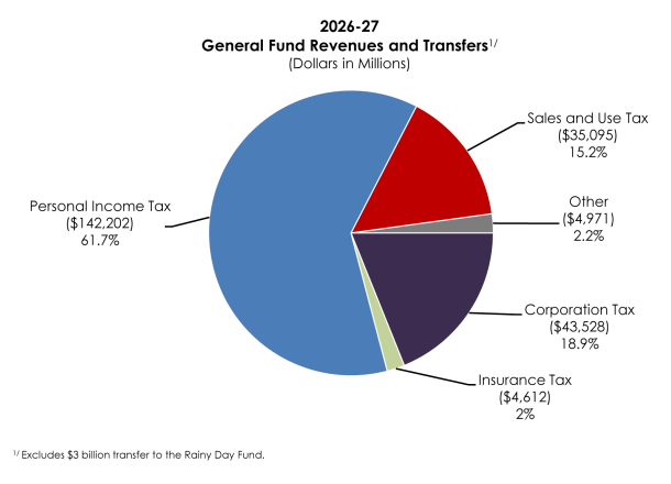 California’s state budget is always a three year exercise in informed guessing, subject to recalibration and revision as taxes and facts are collected and digested. The budget for 2026-27 involves assumptions about 2025-26, still in progress, and 2024-25, with remaining collections still underway. The state uses rainy-day reserves to cushion the impact of lean budget years.