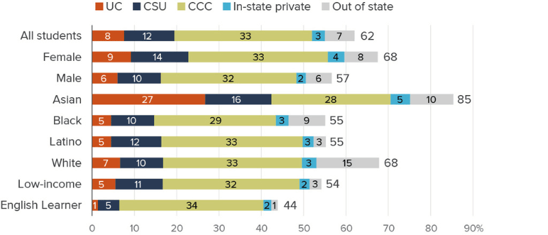 Meanwhile, while some kids are motivated by grades, others just aren’t. As we explore in Ed100 Lesson 9.8, most high school students don't aspire to attend a selective college. It's the exception, not the norm. In 2025, the Public Policy Institute of California released a superb fact sheet about it, including this chart of the estimated share of high school graduates enrolled: